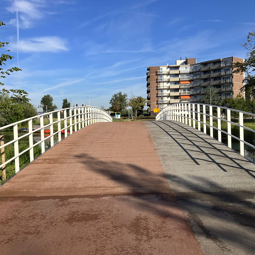 The Municipality of Haarlem also decided to equip the GRP bridge decking of the pedestrian and cycle bridges with different colours of anti-slip and wear layers. In addition to choosing between a grain size of 0.7 to 3.0 mm, it was also possible to choose a colour within this project. The standard colours of our wear layers are grey, black, red and sand. A difference in colours on the GRP bridge deck promotes safety on the bridge and is therefore always recommended. This is because it is immediately clear to users of the bridge which part they need to cross. Our reliable wear layers consist of Amaril granules. The granules are iron-containing, bonded minerals that together are highly resistant to acids, fats, oils and changing weather conditions.