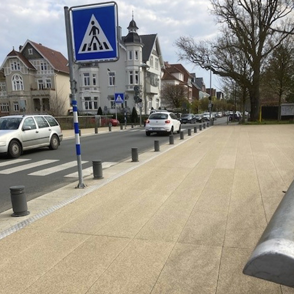 The renovation of the pedestrian bridge over the Deutsche Bahn in Bad Oeynhausen (Germany) is a fine example of the impact our GRP bridge decks have on the living environment. The existing wooden planks were impassable in wet weather. This meant that pedestrians had to cross at a different location, which affected the streetscape. The wooden footbridge, less than 20 years old, eventually had to be closed off completely due to the risk of slipping. The city of Bad Oeynhausen had to look for an alternative footbridge, preferably one that was sustainable and quick to install. The city called in our experts for the renovation of the footbridge to supply 904 m² of GRP bridge decking (500.55) with a sand-coloured wear layer to the external contractor. This type of GRP bridge decking can withstand heavier loads, which means that, in an emergency, service vehicles can also cross it with ease.
